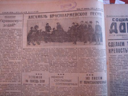 Из подшивки главной газеты Донецкой области «Социалистический Донбасс» за 1935 год, хранящейся в фондах Госархива ДНР, узнаем о первых гастролях этого творческого коллектива в наш край. В номере за среду 27 февраля в статье автора, подписавшего материал просто инициалом Б, сообщалось, что в ближайшие дни в городе Сталино (тогда так назывался современный город Донецк) выступит ансамбль Красноармейской песни Центрального дома Красной Армии.