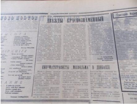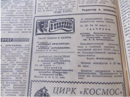 В номере «СоцДонбасса» за 22 марта в статье «Дважды Краснознаменный» в рубрике «Наши гости» солиста Донецкой филармонии Л.Клыкова рассказывалась история создания ансамбля и программа его выступления в Донецке. У нас артисты должны были исполнить произведение Б.Александрова и А.Александрова «Я — гражданин Советского Союза», знаменитые «Калинку» и «Коробейники», украинские народные песни и другие произведения. Отмечалось, что зрители смогут встретиться с Народными артистами СССР Евгением Михайловичем Беляевым (1926-1994) и Алексеем Тихоновичем Сергеевым (1919-1998), Народными артистами РСФСР Вадимом Львовичем Руслановым (1926-1996) и Иваном Семеновичем Букреевым (1924-1998), а также другими солистами.