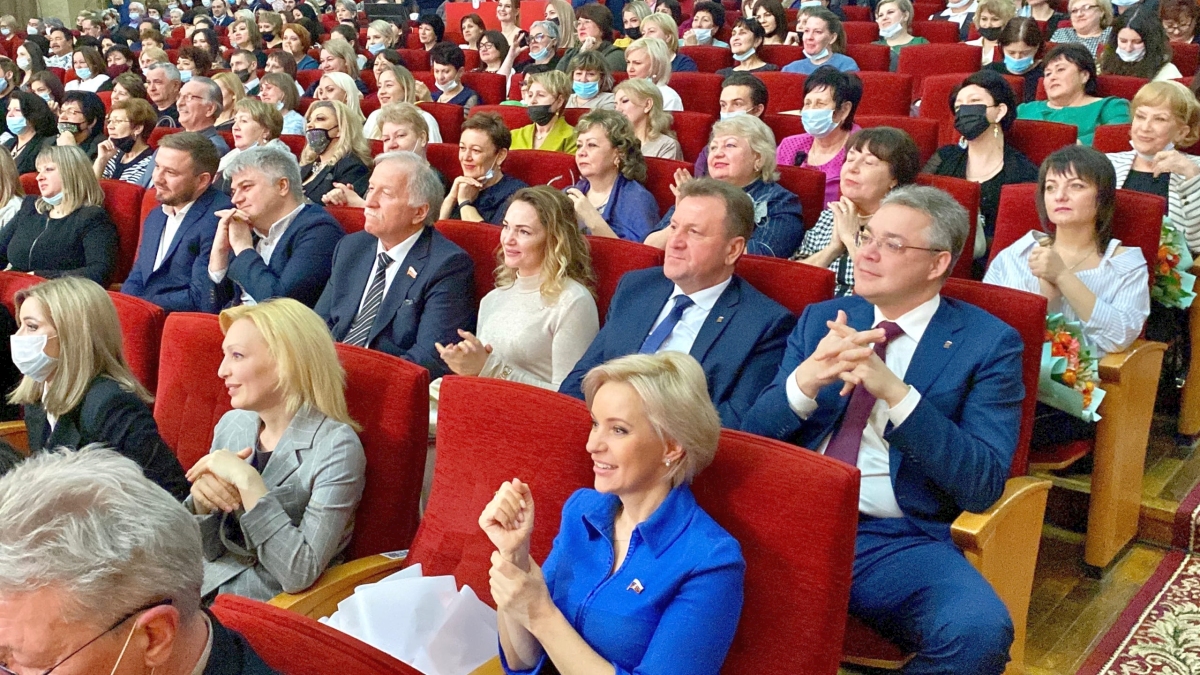 Его официальную часть открыл губернатор Ставропольского края Владимир Владимиров. Со словами уважения и благодарности он обратился ко всем работникам культуры, подчеркнув важность того дела, которому они посвятили свою жизнь, и пожелав всем скорейшего мира. Персонально «Донбасс» поприветствовала депутат Государственной Думы Российской Федерации Ольга Казакова, подчеркнув заслуги нашего ансамбля по сохранению русской культуры в столь непростое время. «Именно Ставрополье удостоилось чести принимать сегодня этот коллектив», – подчеркнула Казакова и пригласила на сцену генерального директора-художественного руководителя «Донбасса» Ольгу Горячеву, чтобы торжественно вручить коллективу ансамбля Благодарность министра культуры Российской Федерации Ольги Любимовой за большой вклад в развитие культуры и в связи с 85-летним юбилеем, который коллектив отмечает в текущем году. Отдельным сюрпризом стало вручение «Донбассу» тульской гармони – подарка от партии «Единая Россия» и федерального проекта «Культура малой Родины» – «чтобы всегда звучала музыка дружбы». «Мы всегда с вами на связи и будем помогать всем, чем сможем!», – сказала Ольга Казакова.