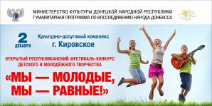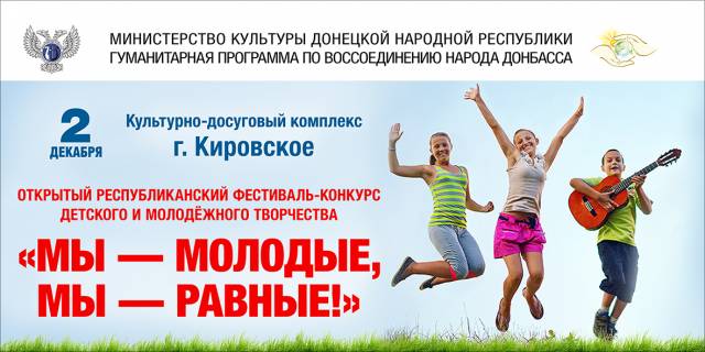 22 ноября завершился прием заявок на открытый республиканский фестиваль-конкурс детского и молодежного творчества «Мы – молодые, мы – равные». Напомним, фестиваль-конкурс проводится Министерством культуры Донецкой Народной Республики, Донецким республиканским учебно-методическим центром культуры и искусства и администрацией г. Кировское в рамках реализации Гуманитарной программы по воссоединению народа Донбасса