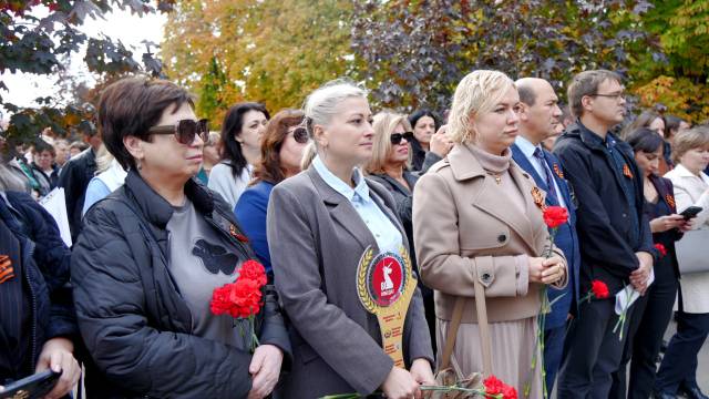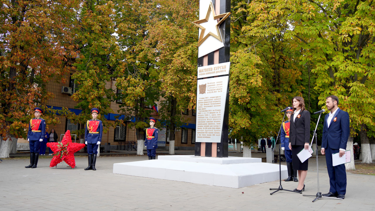 Церемонию передачи «Венка славы» в поселке Матвеев Курган у стелы «Рубеж воинской доблести» сопроводил митинг-реквием с участием почётных гостей, представителей делегаций, духовенства, ветеранских организаций и юнармейцев.