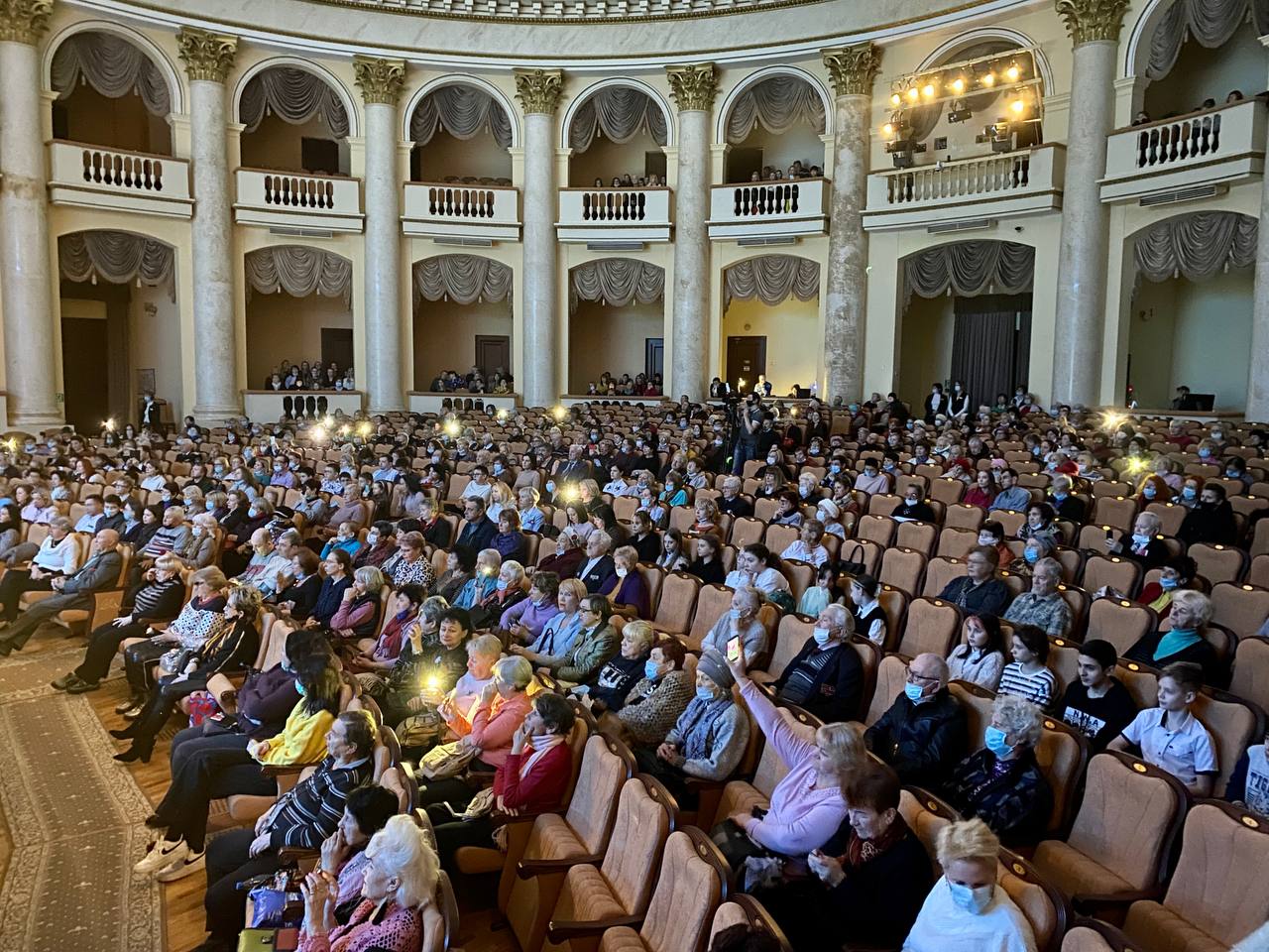 Все места в зрительном зале, доступные с учётом противоэпидемической рассадки, были ожидаемо заняты – в Сочи наш коллектив не выступал много лет, и можно с уверенностью говорить, что местная публика по «Донбассу» соскучилась. Каждый выход артистов коллектива сопровождался бурными аплодисментами, а на двух номерах программы – «Синей вечности» из репертуара Муслима Магомаева, блестяще исполненной солистом ансамбля Евгением Васькиным, и «Моряках Азовской флотилии» – публика и вовсе отбила ладоши. Эти композиции стали своеобразным адресным подарком жителям приморского города от «донбассовцев», и зрители это сполна оценили. Отдельного слова заслуживает «Молитва за Донбасс» в исполнении Виктории Струковой – во время этого номера сочинцы в едином порыве зажгли фонарики, словно общую свечу памяти и скорби обо всех жертвах украинской агрессии в Донбассе. А ярким завершением концерта стала коллективная композиция «Небо над водой» – о любви к своей земле и верности исконным ценностям нашего народа.