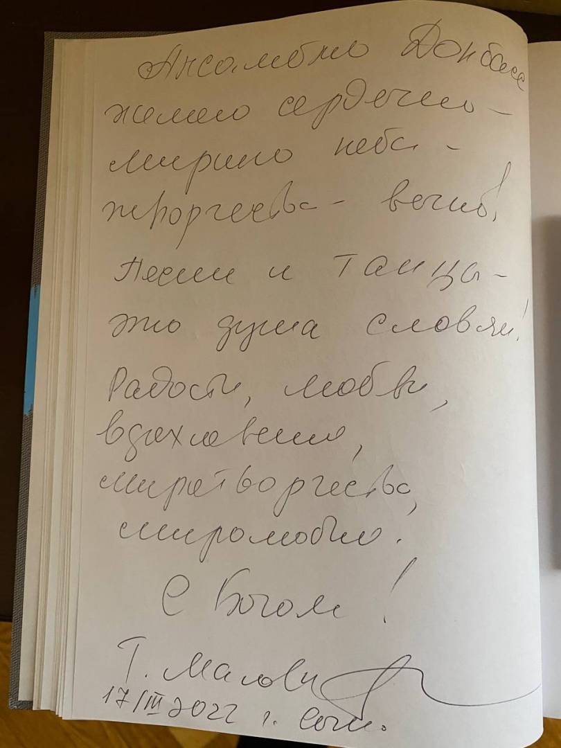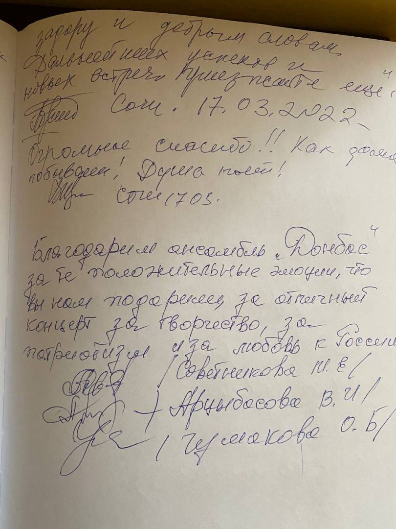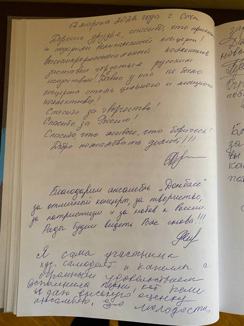 Добавим, что также в этот день состоялась встреча генерального директора-художественного руководителя ансамбля «Донбасс» Ольги Горячевой с главой администрации г. Сочи Алексеем Копайгородским. Он выразил искреннюю поддержку всему Донбассу, пожелал ансамблю успешных гастролей и вручил подарки, которые, несомненно, оставят у коллектива добрую память о визите в этот тёплый во всех смыслах город. По окончании концерта «Донбасс» тут же отправился дальше по гастрольному маршруту – в город Краснодар, где завтра совместно с ведущими творческими коллективами края примет участие в масштабных торжествах в честь празднования восьмой годовщины вхождения Крыма в состав Российской Федерации.
